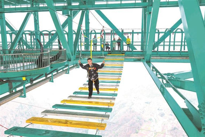不远处,南京游客李林正在高空竞速跑道上行走。这是一条架设在主桥旁边的跑道,在上面行走,仿佛行在云端。