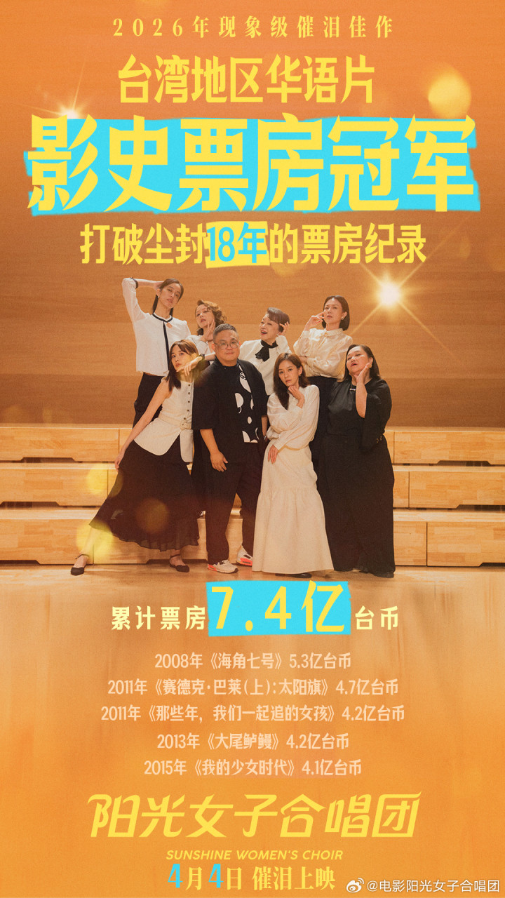 该片此前在中国台湾地区上映后口碑逆袭,成功打破《海角七号》保持18年的票房纪录,成为中国台湾地区影史华语片票房冠军。4月4日,电影《阳光女子合唱团》登陆内地院线,成为清明档的一员。