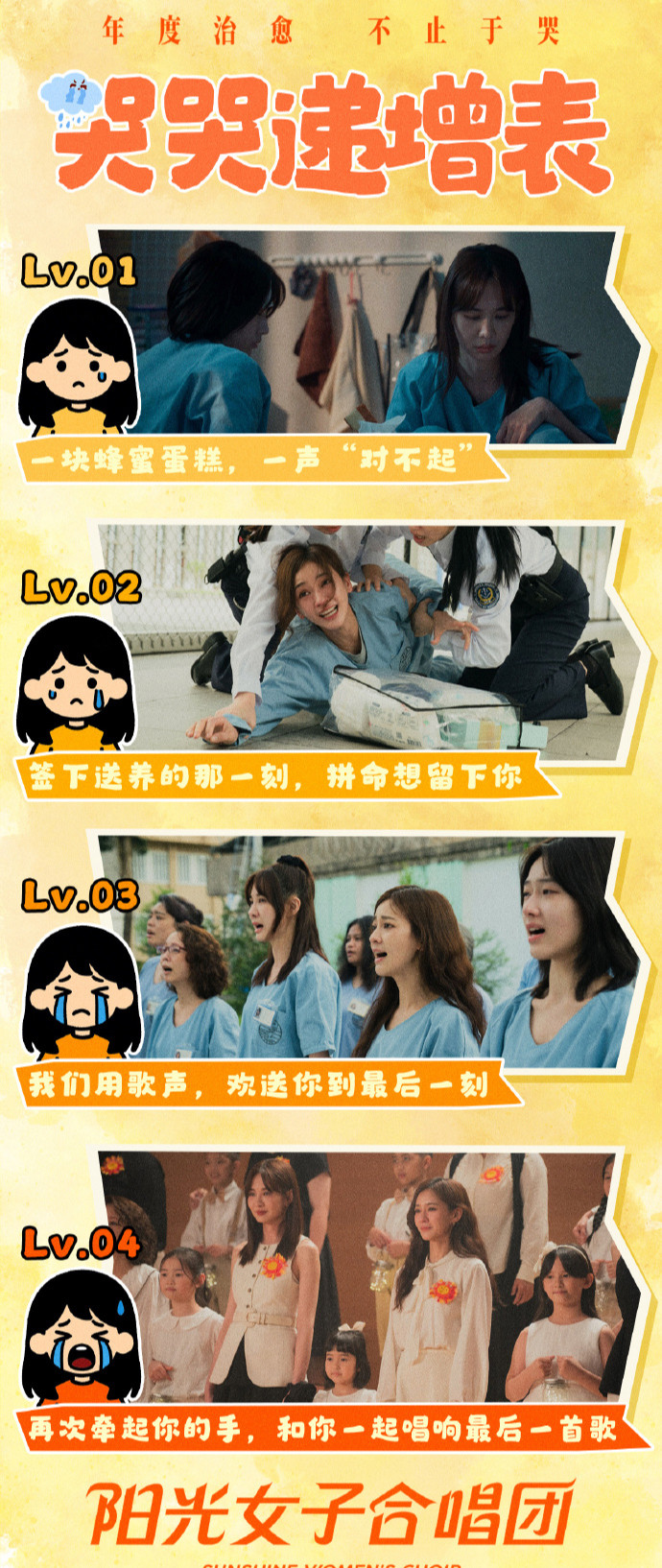 就像这部片子的片名,我觉得“阳光”是很重要的一个意象。阳光很公平,照耀在每个人的身上。只要你愿意往前走一步,就算你在风暴里,人生都会有所不同。当她们接纳了不完美的自己,不论过去做过什么,愿意往前走的那一刻,这个阳光女子合唱团就真正成团了。