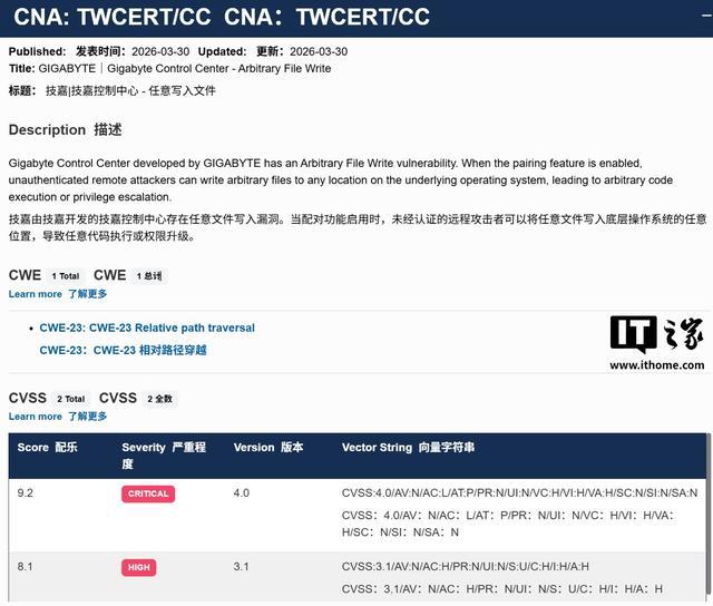 IT之家 4 月 1 日消息,技嘉于 3 月 30 日发布公告,敦促用户尽快升级“技嘉控制中心”(GIGABYTE Control Center,GCC)到 25.12.10.01 及更高版本,从而规避 9.2 分的高危漏洞。