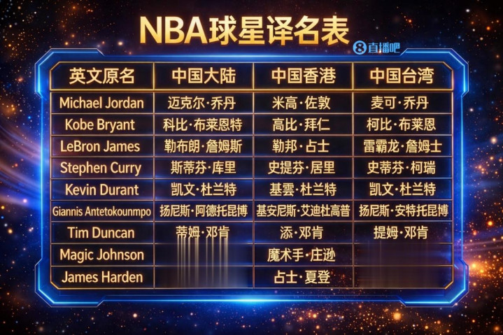 NBA球星在中国大陆、中国香港与中国台湾常常出现“同一人三名称”的现象,其背后原因与三地的语言习惯、历史背景以及外来词音译规则密切相关。